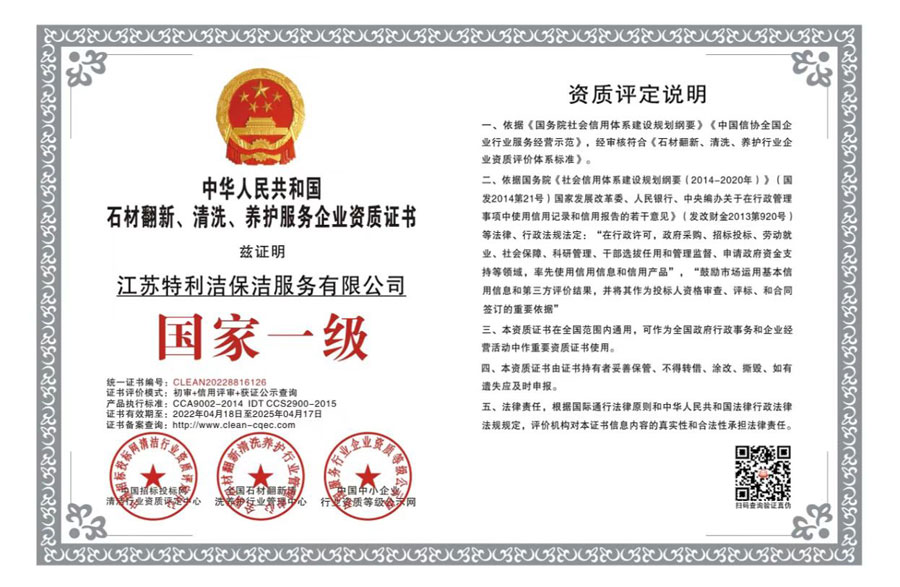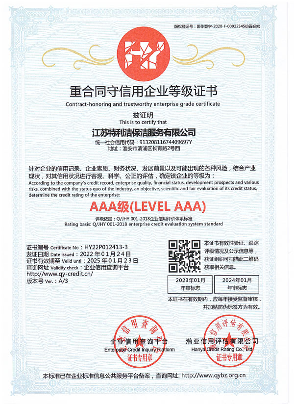 江蘇特利潔保潔服務有限公司(前稱為淮安市特利潔保潔服務有限公司),成立于2003年,于2018年經工商變更登記為“江蘇特利潔保潔服務有限公司”,是經工商部門登記注冊的合法企業。公司員工經系統培訓后上崗,本公司全部采用特利潔專業清洗設備、藥劑,并秉承了特利潔先進的管理模式,具備了專業的清洗技術、服務和網絡優勢以及一批訓練有素的專業清潔隊伍及管理人員,致力于推動淮安清洗行業朝著規范化、專業化、標準化方向發展。公司成立至今,經過我們全體員工的不懈努力,以及本著“誠信、專業、周到”的服務使得接受過我們服務的每一位客戶均能成為我們的長期合作對象。公司也從起初十幾名員工的小公司逐漸發展壯大,現已初具規模,并在保潔行業當中占據一定份額。現與恒大集團等世界500強企業建立戰略合作。2018年10月公司取得三A信用評級、三A重合同守信用單位...